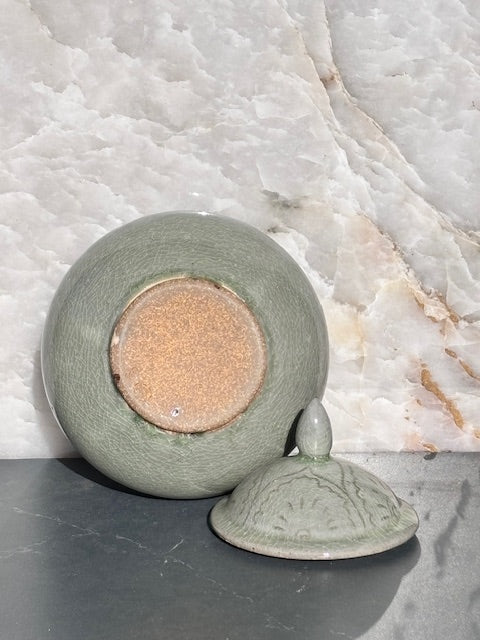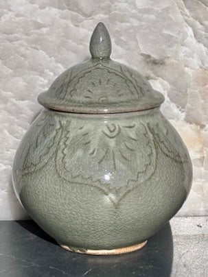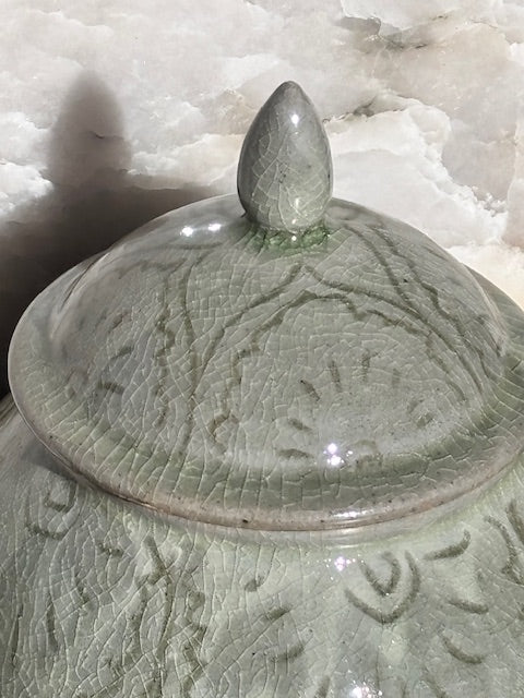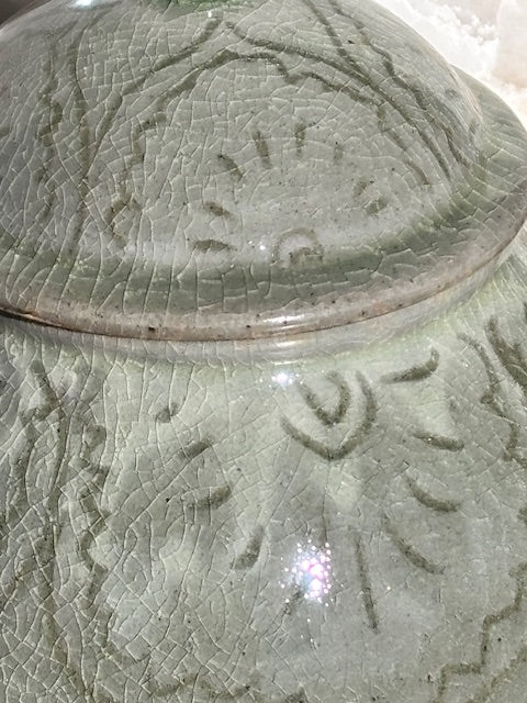 Lovely pale blue/green celadon glaze jar with sgraffito decoration. So pretty.