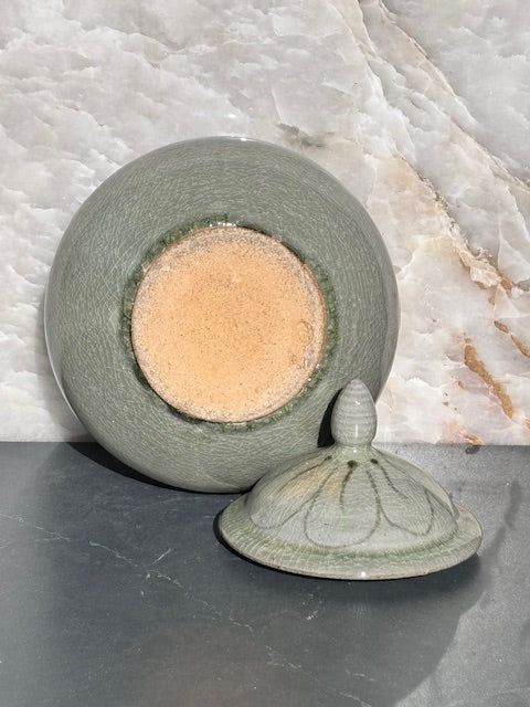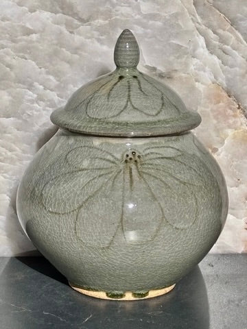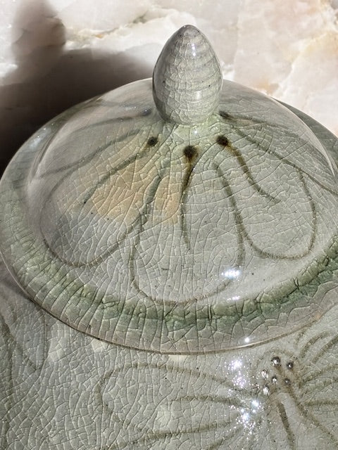 Lovely pale blue/green celadon glaze jar with fun abstract floral motif decoration.