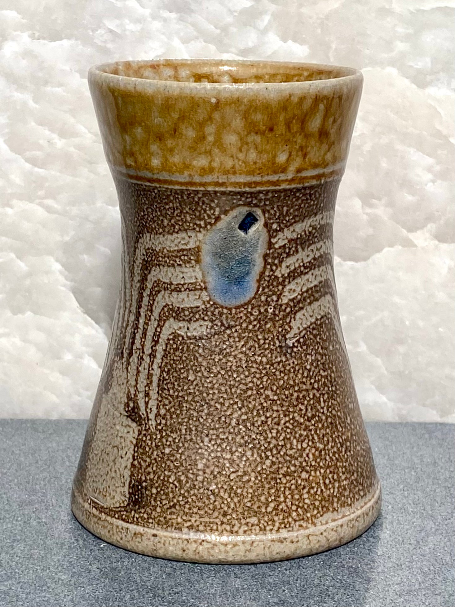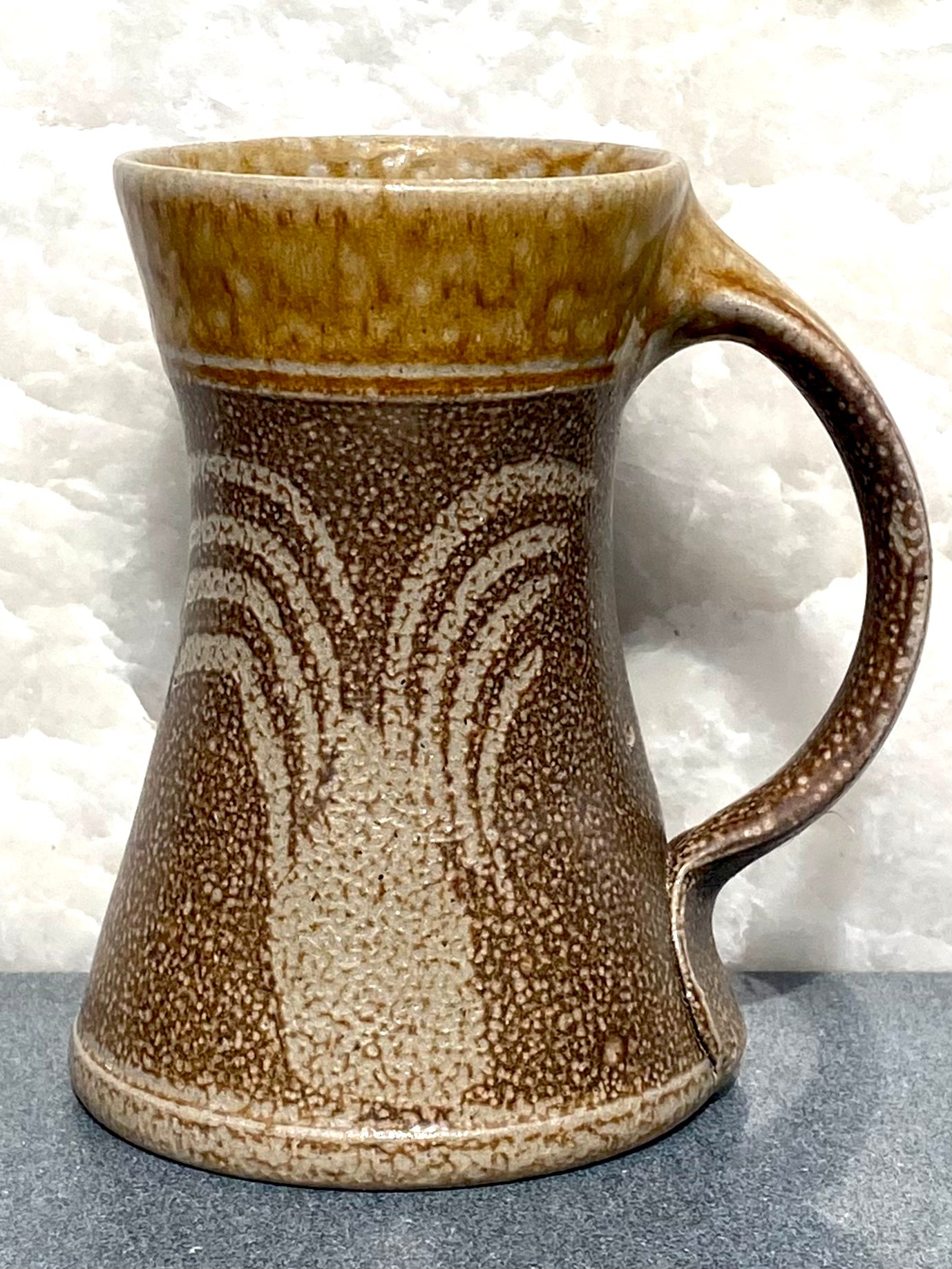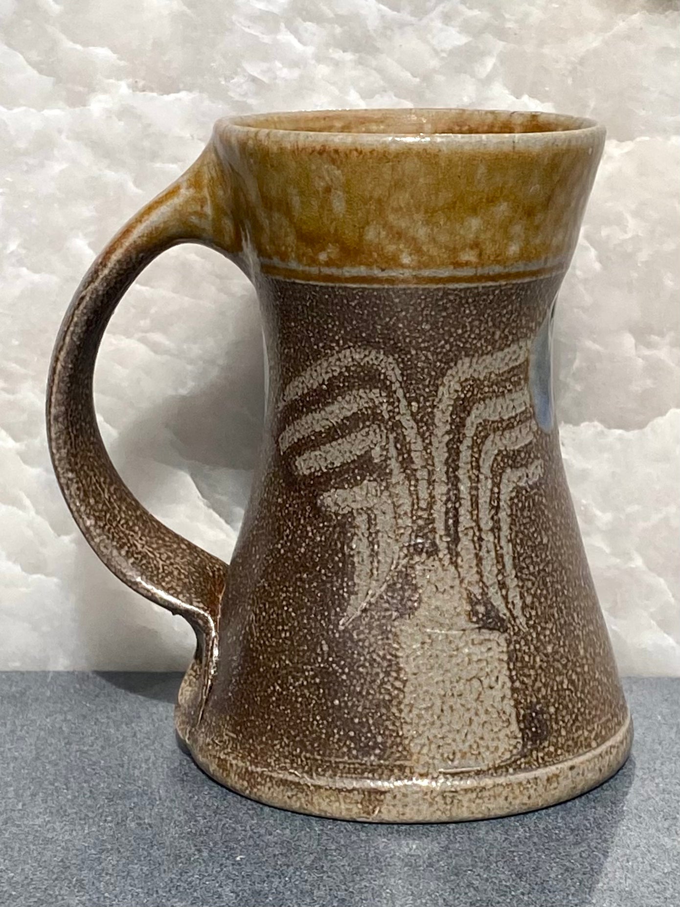Russet slip on tankard style mug with combing decoration that reveals classic salt glaze, with melted blue glass and an ash glaze rim. The color subtly changes as you turn the mug in your hand, thanks to the unique atmosphere of the wood kiln firing process.