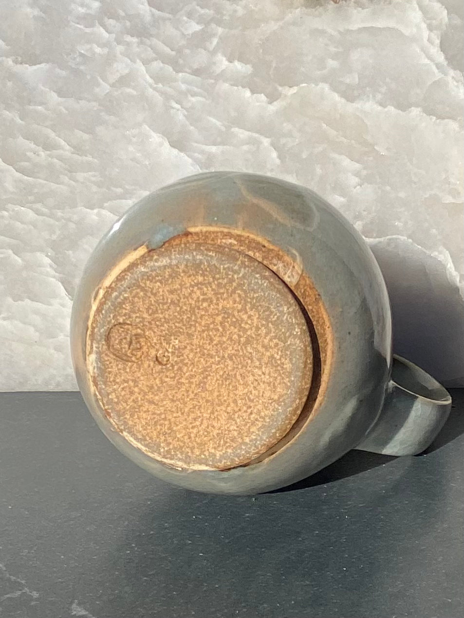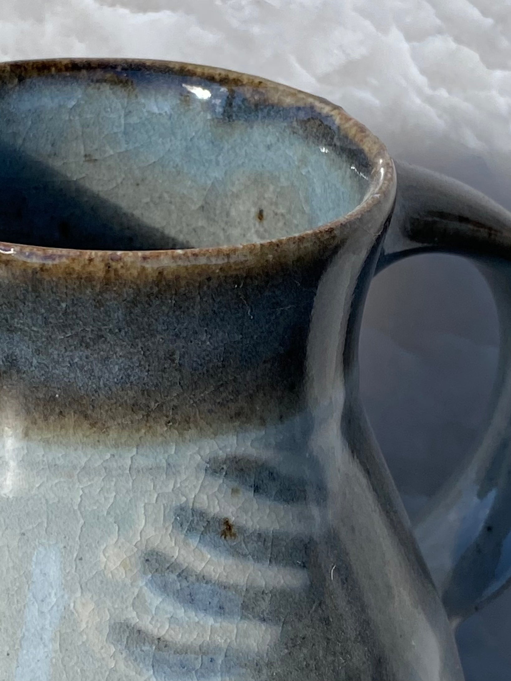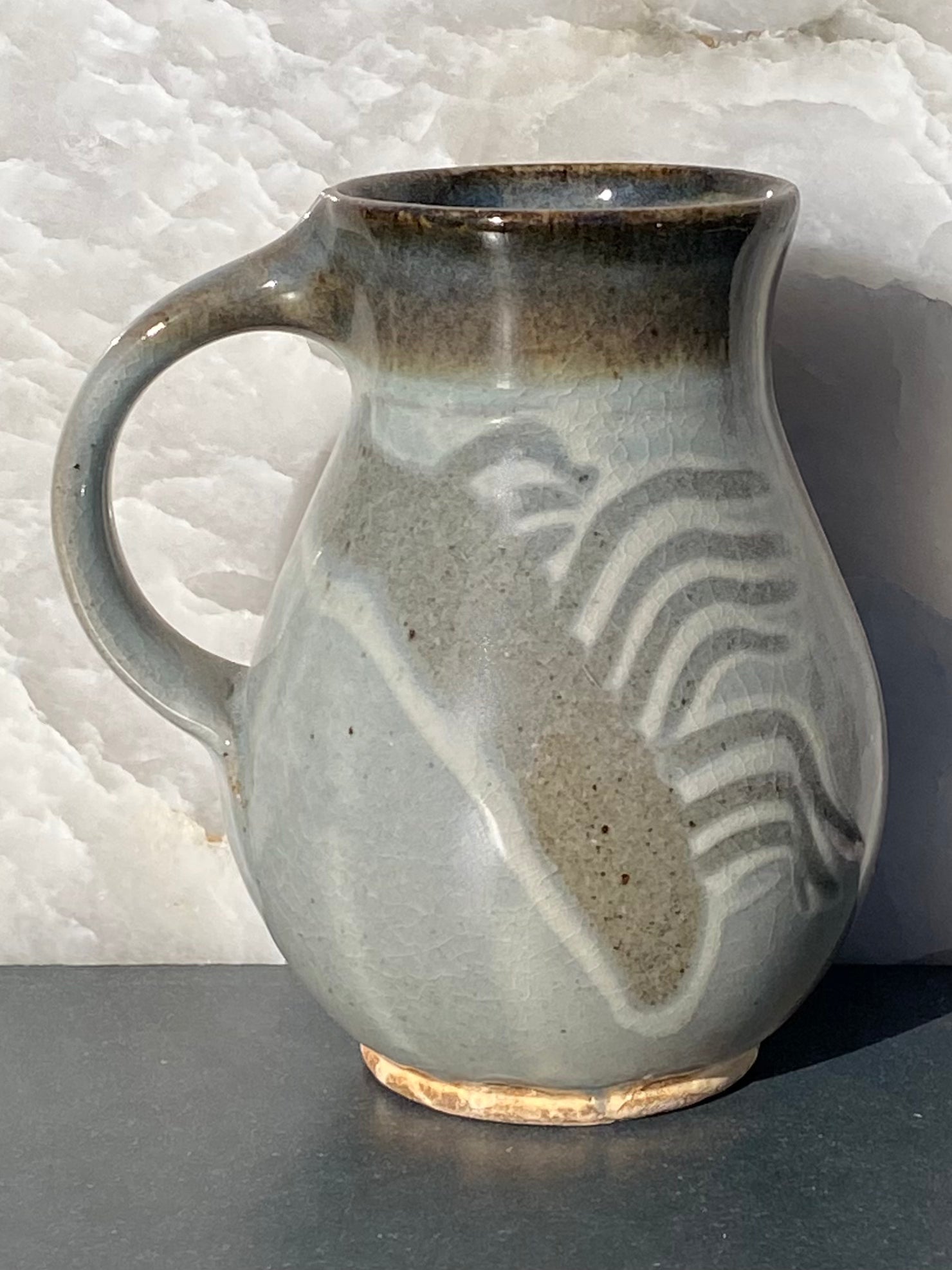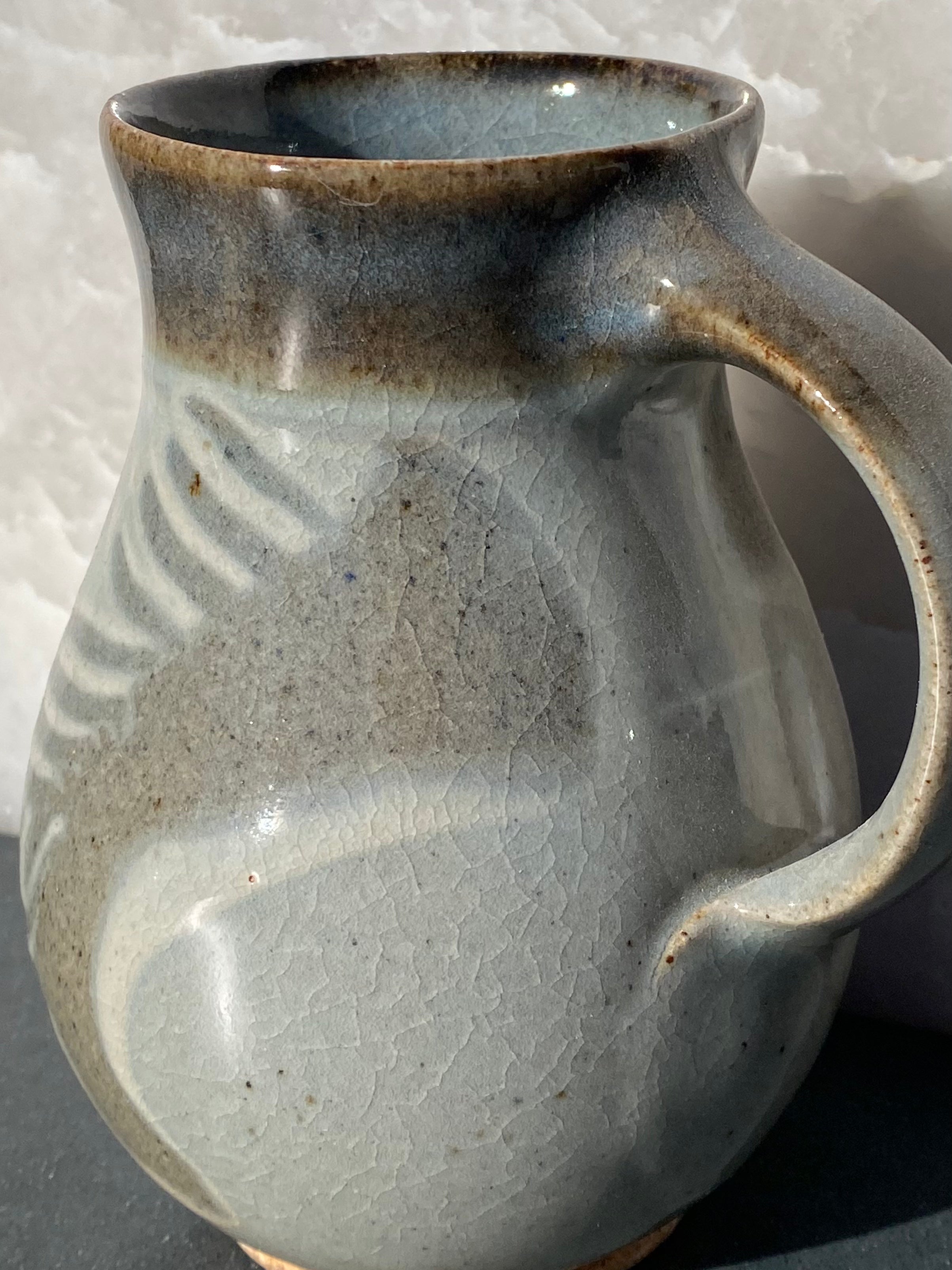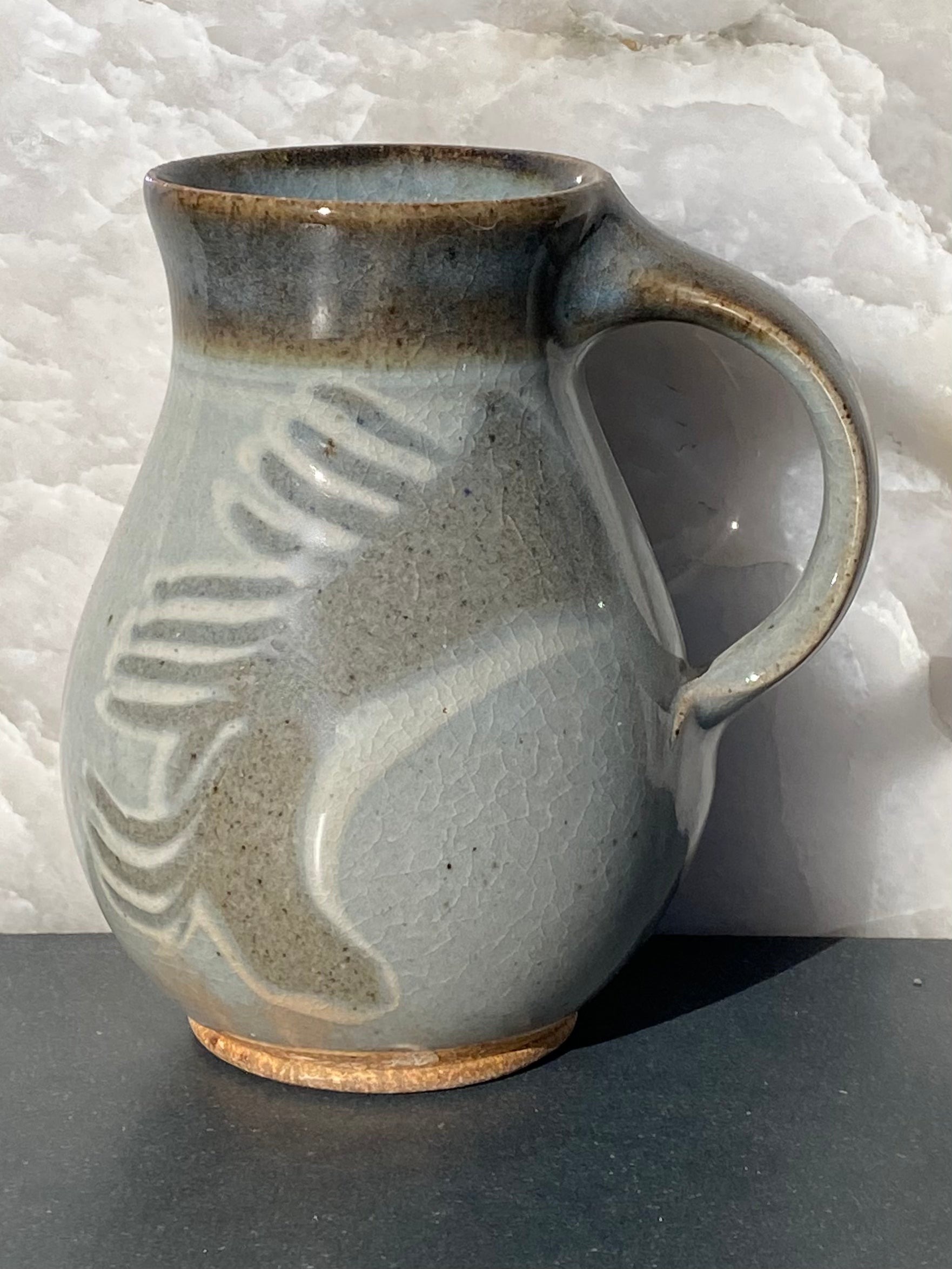 Gray and white combo with lively combed decoration and new blue/russet granite glaze rim on a pleasantly plump mug.