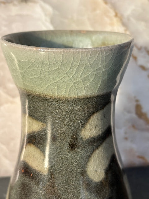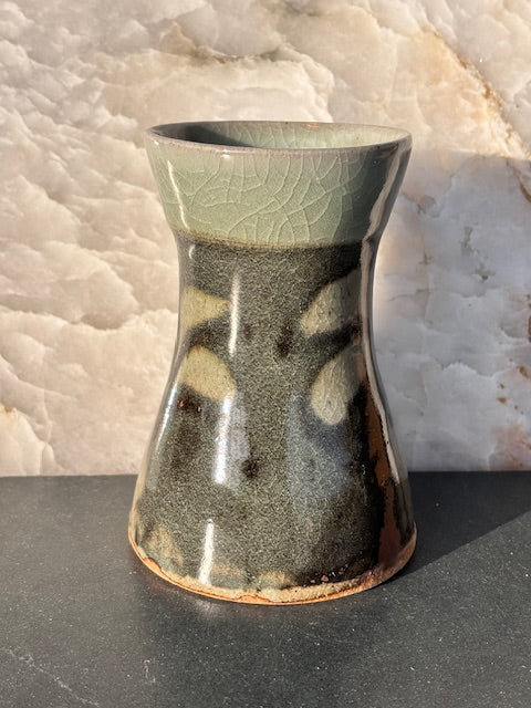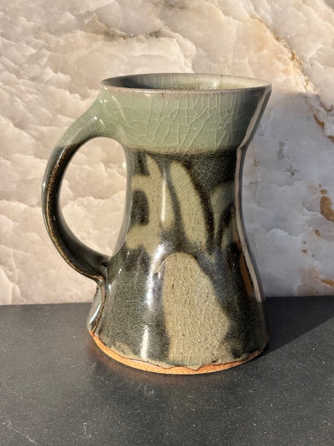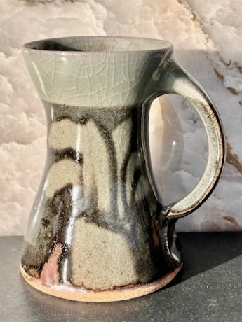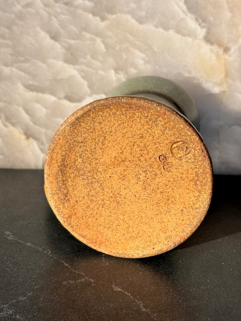 New smoky blue glaze with pale blue rim and finger swiping decoration. And a jaunty wavy line. This is one of the pretty new glazes Mark has created using local granite.