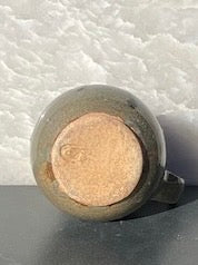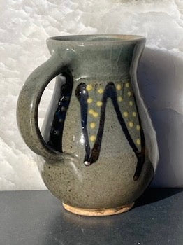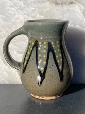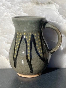 Jaunty yellow dots fill the wavy V's across a blue/green/gray celadon glazed small barrel mug with a creamy contrasting rim.
