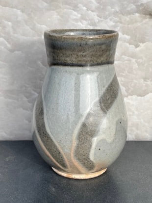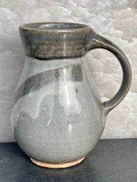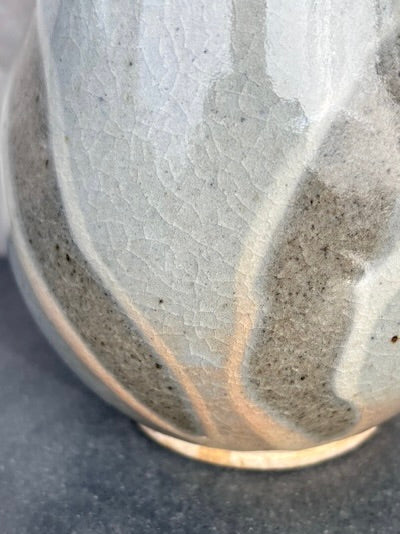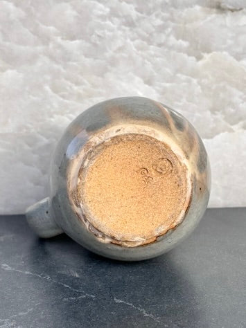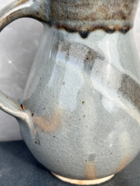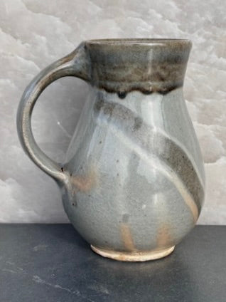 Pale blue/gray celadon glaze mug with diagonal finger swipes, drips of white glaze and a milky blueish rim. Flashes of pink. Lovely. I took these photos just a bit too late in the day. The blue is blue-er... If I get a chance I'll take a few more images. It's very pretty!