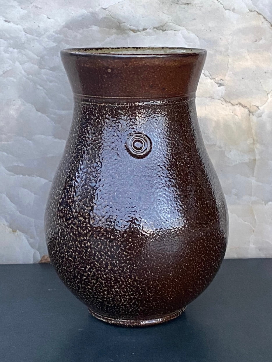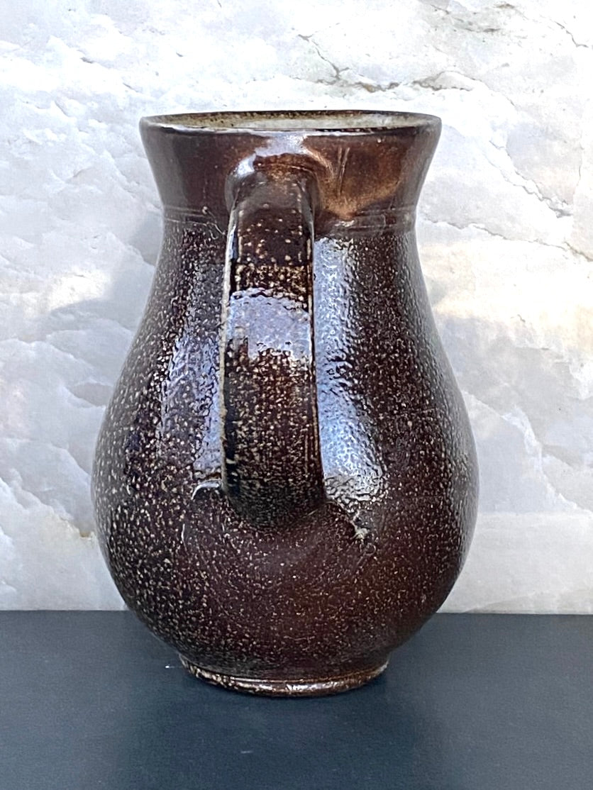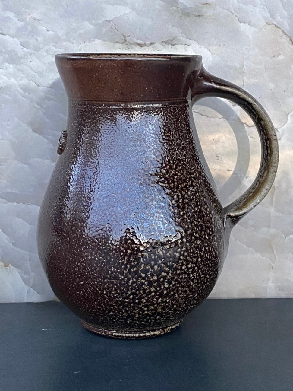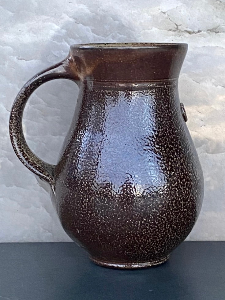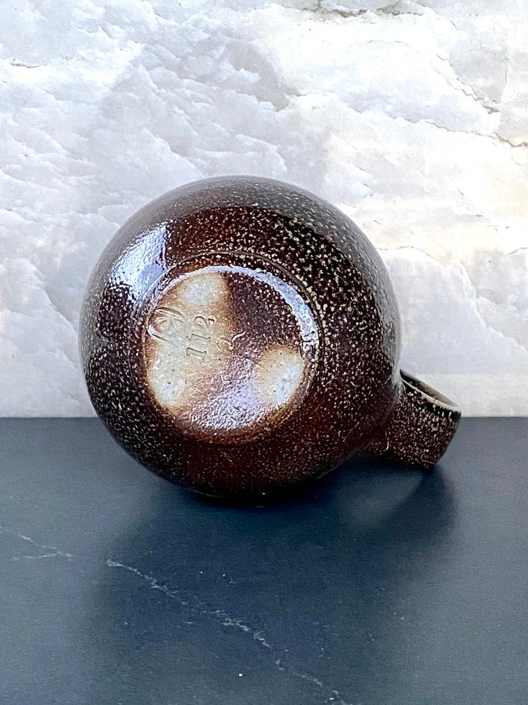 Classic salt glaze brown mug with iron slip on rim and a sweet collection of medallions at the neck. On the front more salt and ash landed and melted to create a shiny surface while the sides and back got less salt, ash, and heat and are softer, quieter... As you turn this mug around, the beauty and appeal of wood firing is right there in your hand.