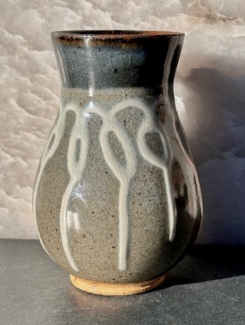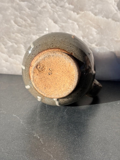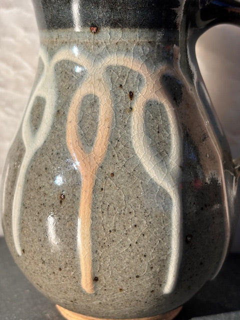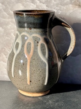 Fabulous large mug with tactile white looping swags on a gray/green celadon glaze background. A few loops flashed to pink of the front. The rim is dipped in the new slate blue glaze. Stunning.