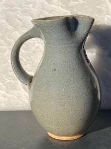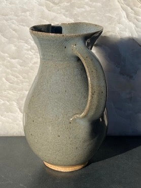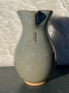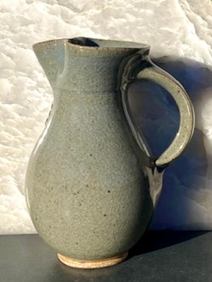 Blue celadon glaze pitcher with a trio of medallions at the neck. This very useful size also doubles nicely as a vase.
