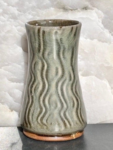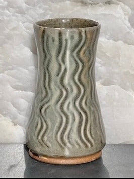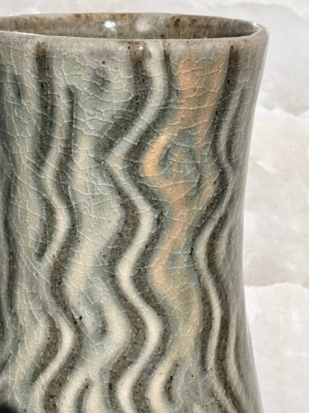 Milky white and gray combed decoration run down this lovely tumbler with a flash of pink, another one of the fabulous new glazes Mark has created using local granite.