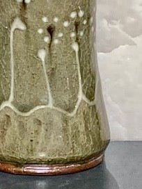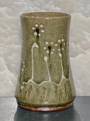 Green celadon glaze tumbler with floral motif. White stems and white and black blossoms. Lovely variation in the color as you turn it in the light. Beautiful to the eye and the touch.