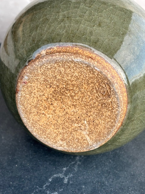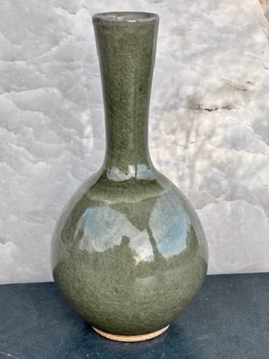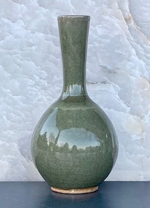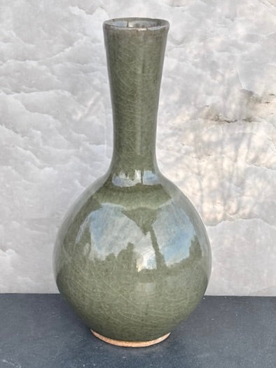 Long neck silky green celadon glazed vase with lovely pooling of the glaze on the shoulder. It's hard to capture the color and just how pretty it is, but it will not disappoint! Different photos were taken on different days!