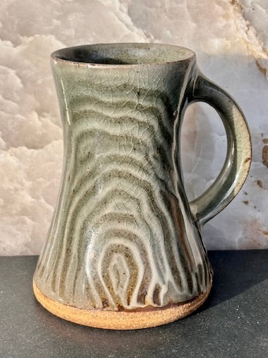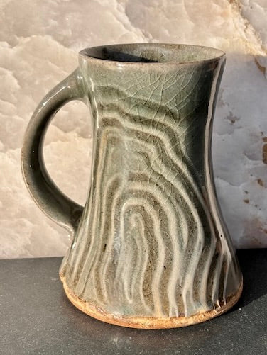 Silky pale blue/green/gray celadon glaze mug with elaborate combed decoration. This is a beautiful new glaze Mark created for the recent gas firings and stamped G4.