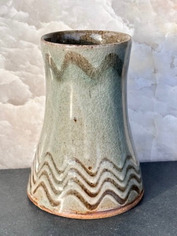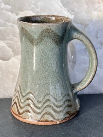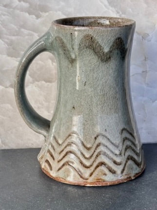 Handsome blue/gray/green celadon glaze mug with a wavy combed decoration at the base and a single wavy line at the rim. This is a new glaze Mark created for the recent gas firings and stamped G4.