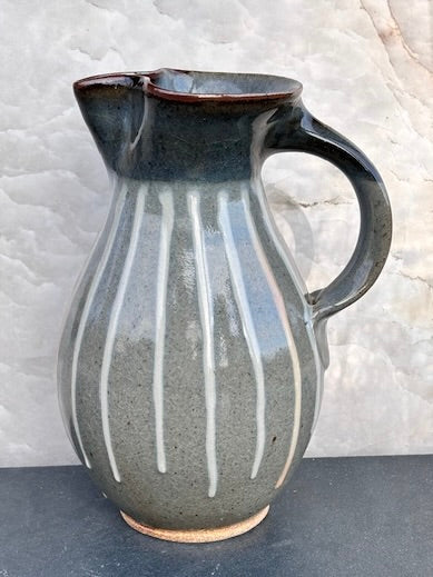 Very pretty pale blue/gray celadon glaze pitcher with a vertical white slip trailing lines down the body that flash to pink in places and a handsome contrasting slate blue rim.