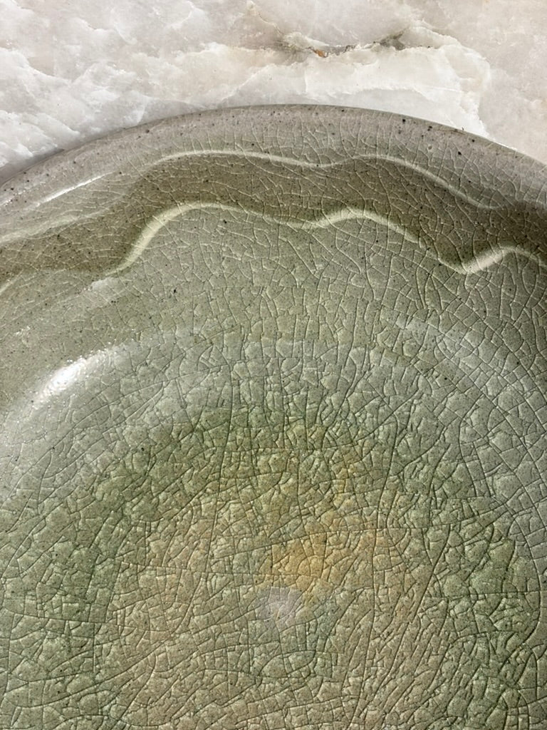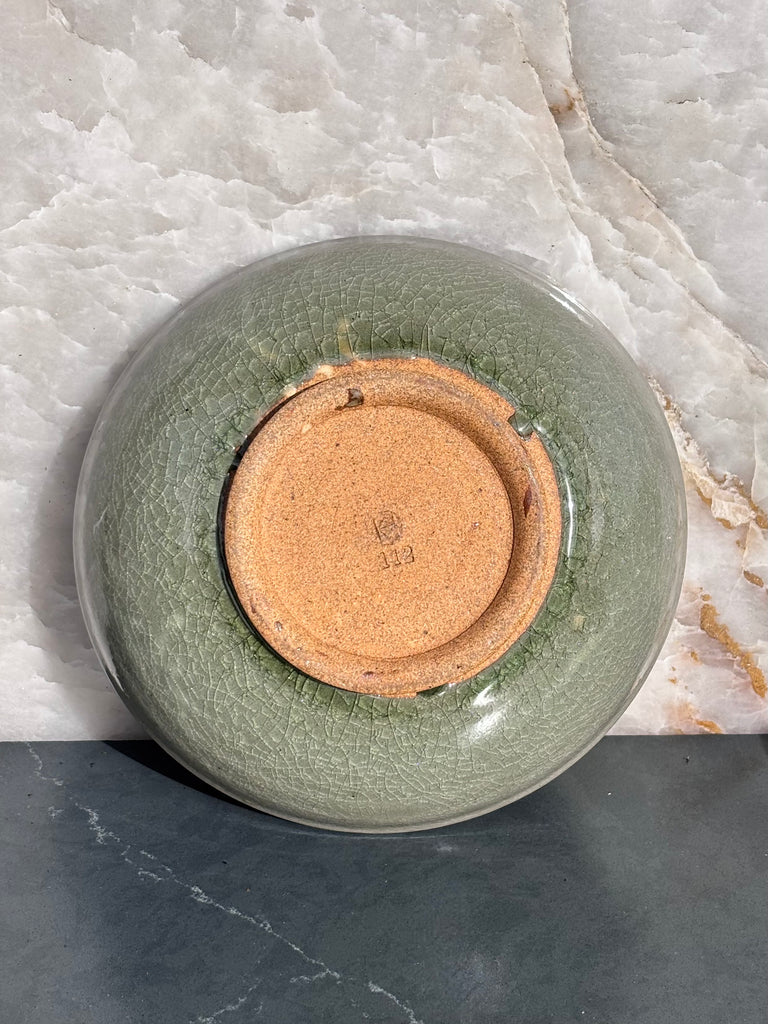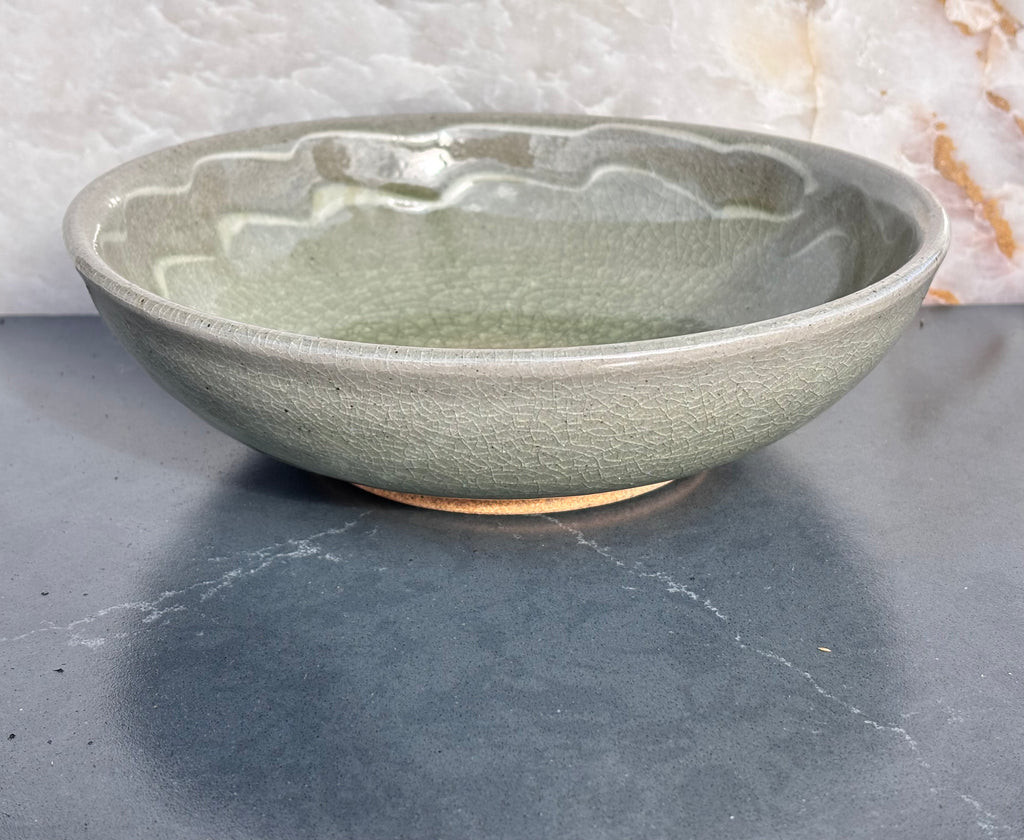 Pale blue/green celadon glaze bowl with a ribbon of loops around the inside rim. Another very pretty new glaze combo that is tricky to photograph!